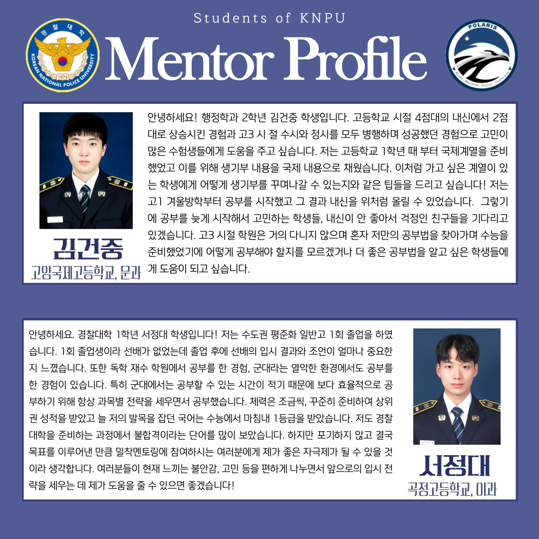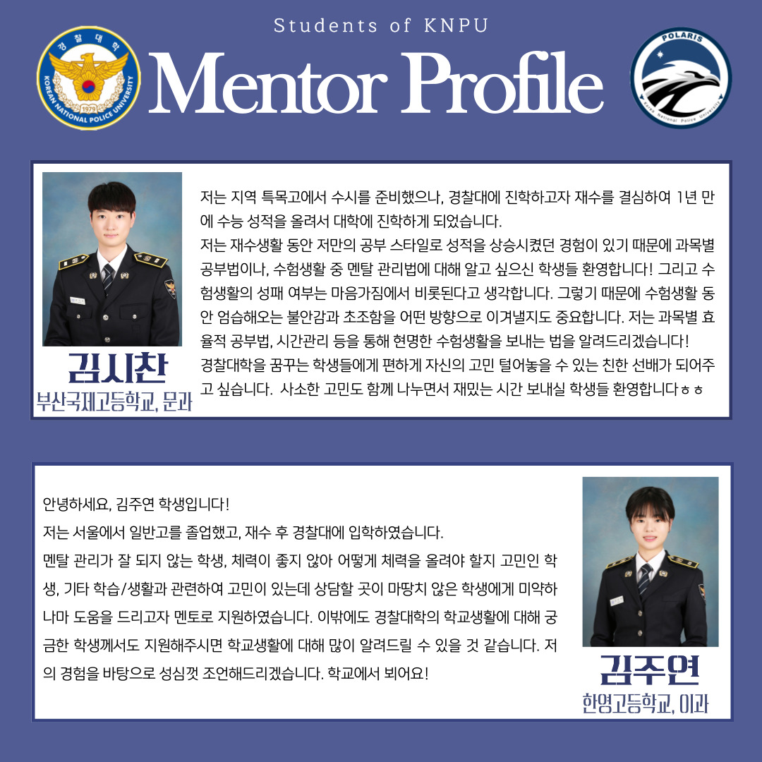 경찰대학에 관심이 있으신 분들, 경찰대학에 대해 보다 많은 것을 알고 싶으신 분들, 경찰대학생의 멘토링이 필요하신 분들!