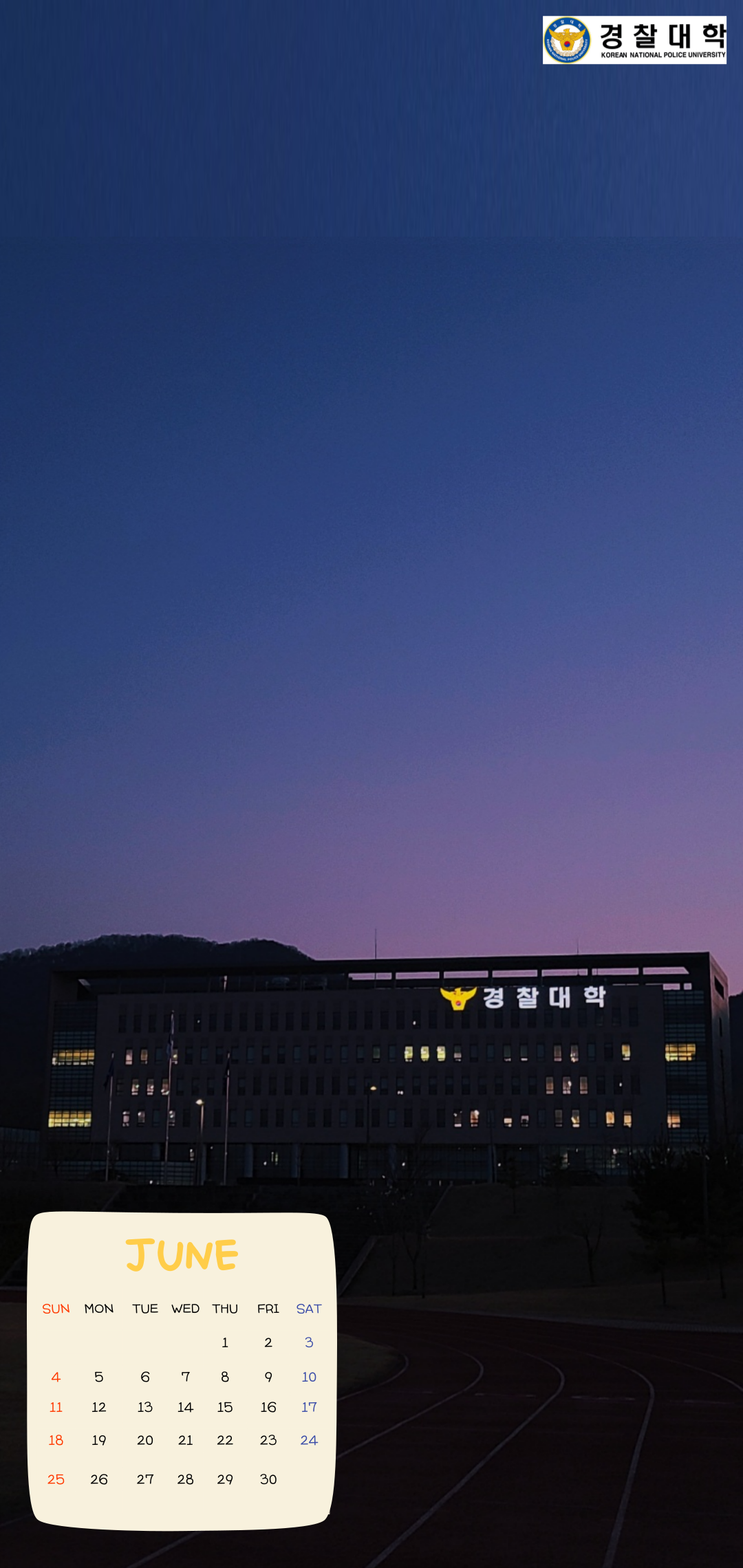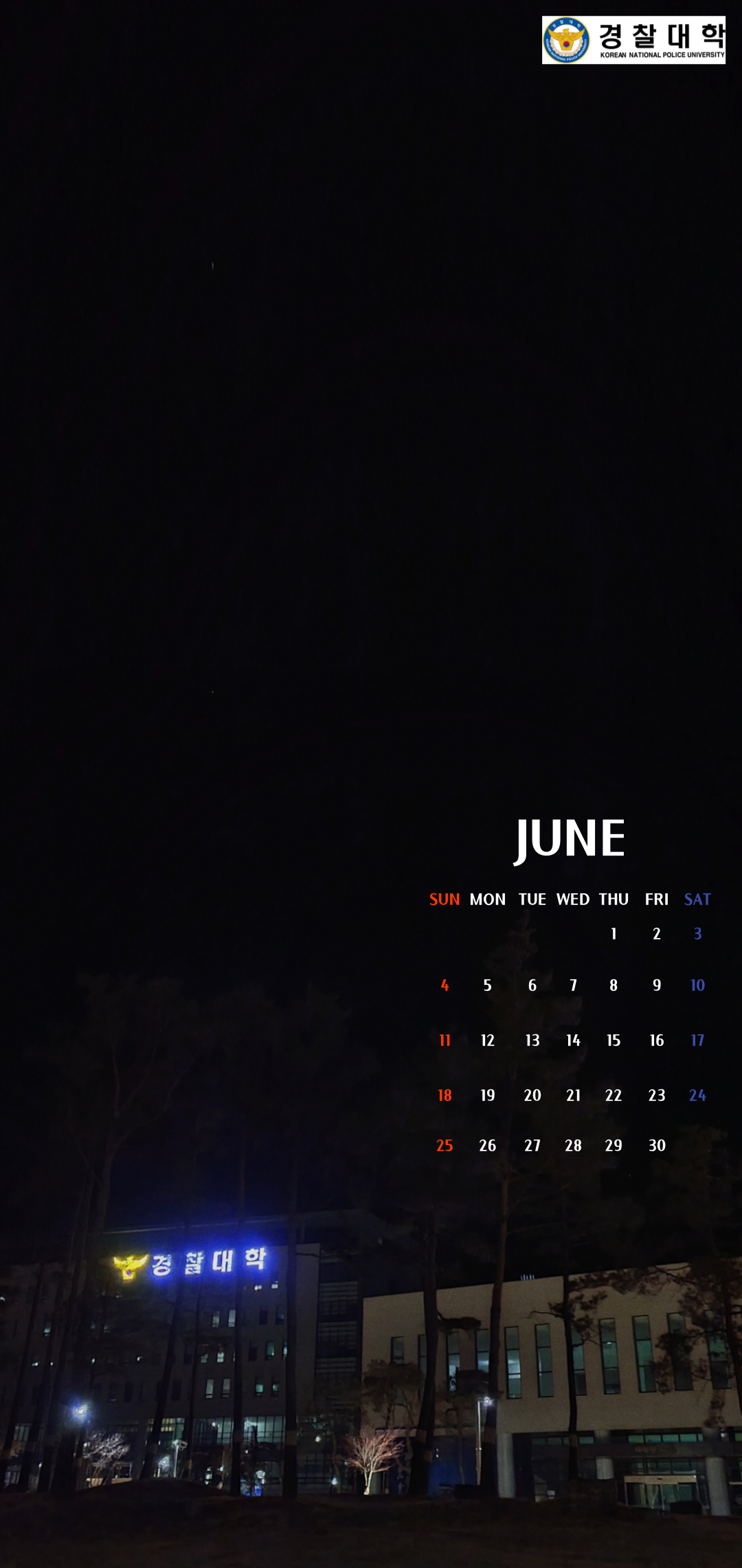 어느덧 봄이 지나 여름이 훌쩍 다가왔습니다! 경찰대학도 시간이 지난만큼 더욱 푸르러졌는데요. 봄과는 또 다른 매력을 갖고 있는 경찰대학의 초여름의 모습을 담아 이번달에도 역시 배경화면을 제작하였습니다. 짧아지는 밤에 대한 아쉬움이 묻어난건지 이번 달 배경화면에는 유독 경찰대학의 야경 사진이 많이 사용되었습니다:) 원하시는 배경화면으로 골라 사용하시면 될 것 같습니다. 7월의 경찰대학 모습을 담은 배경화면과 함께 다시 찾아뵙겠습니다. 감사합니다.
