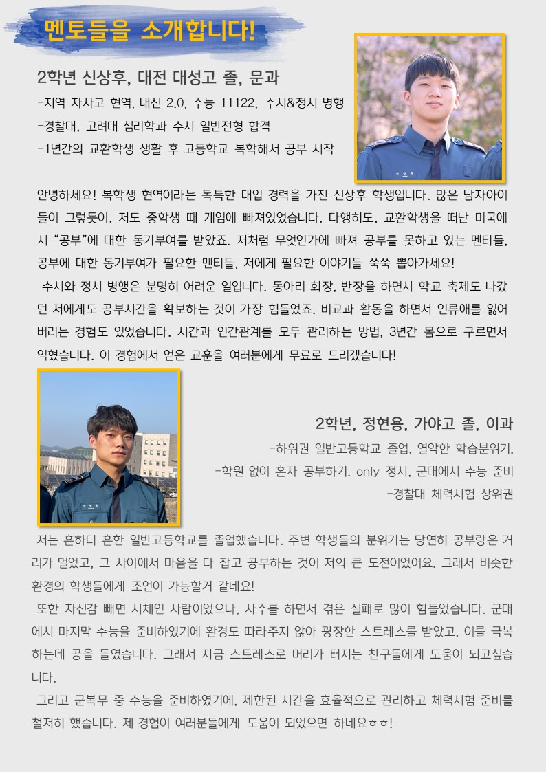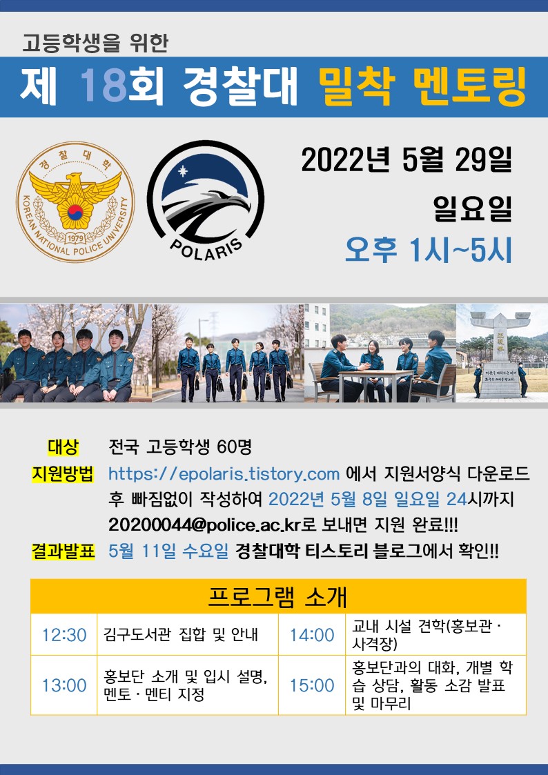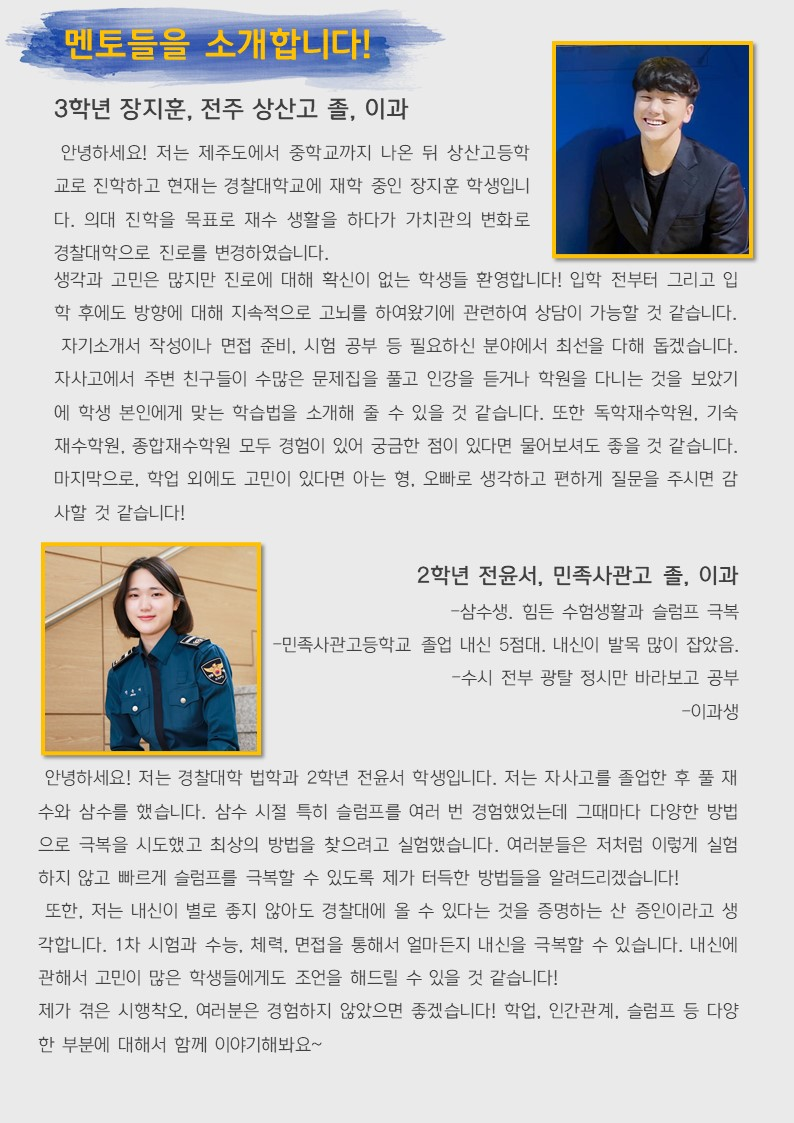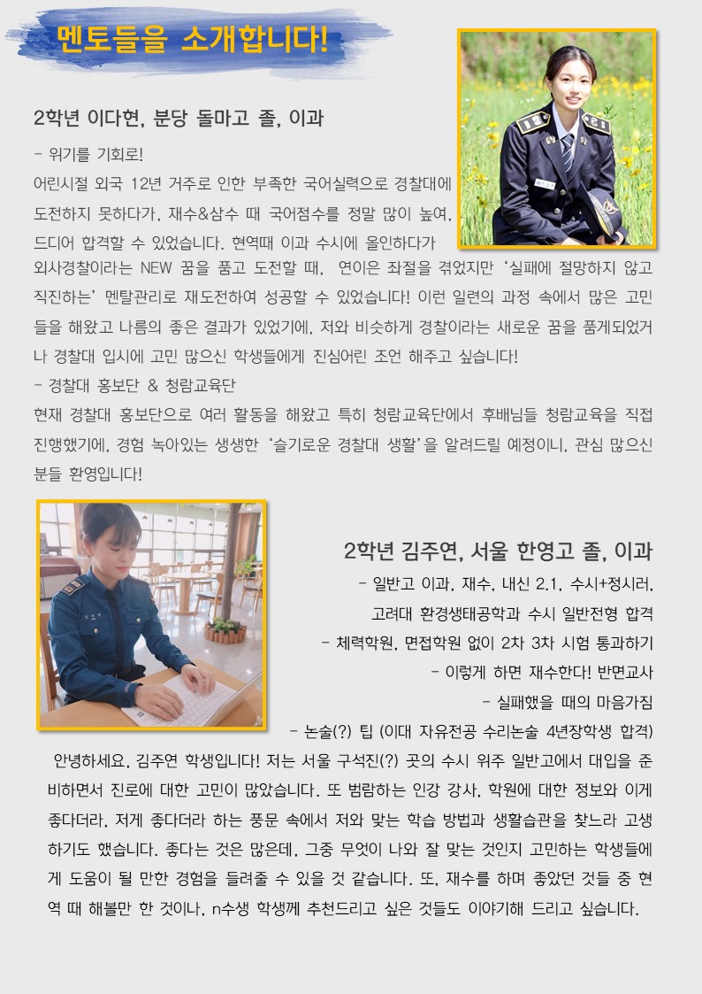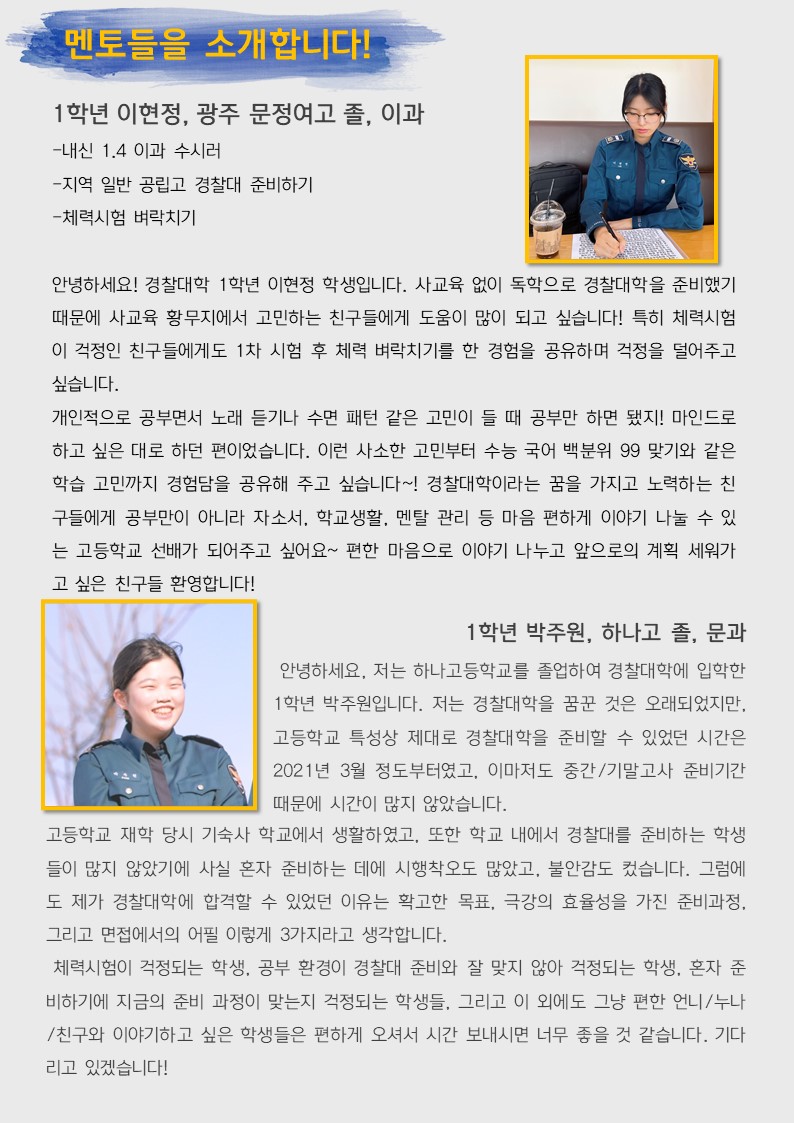 경찰대학에 관심이 있으신 분들, 경찰대학에 대해 보다 많은 것을 알고 싶으신 분들, 경찰대학생의 멘토링이 필요하신 분들!