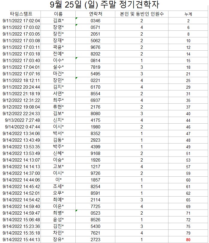 2022년 9월 25(일) 주말 정기견학 대상자 명단을 다음과 같이 올려드립니다!
